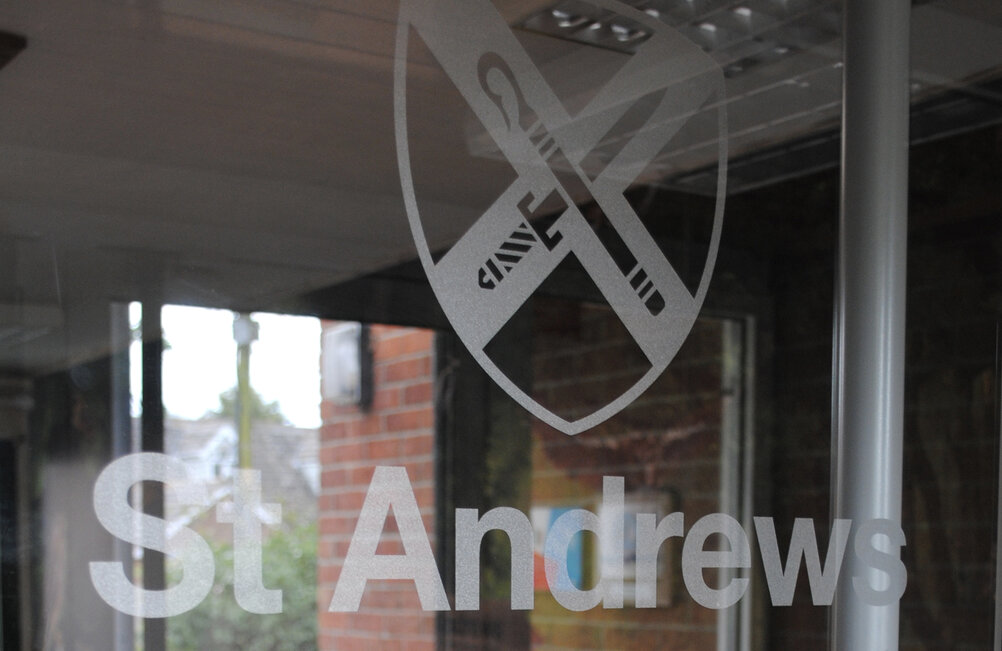 To further improve the entrance we developed a frosted vinyl window graphic of a woodland silhouette that included the schools branding.