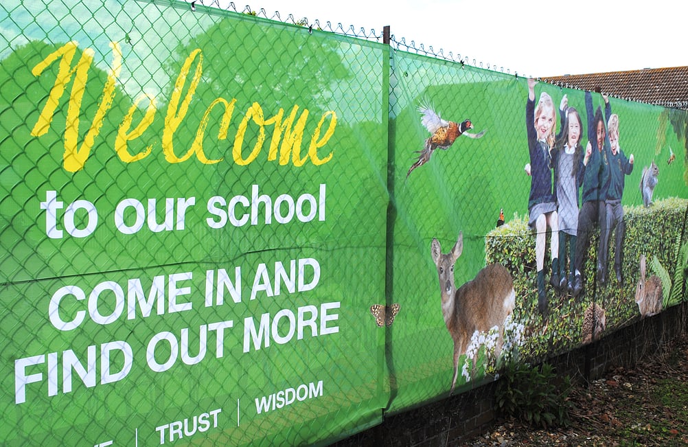 Following this style we designed a large 10 metre mesh banner for the exterior front fence to draw more attention to the school. This included a hedge, woodland animals and actual student images.