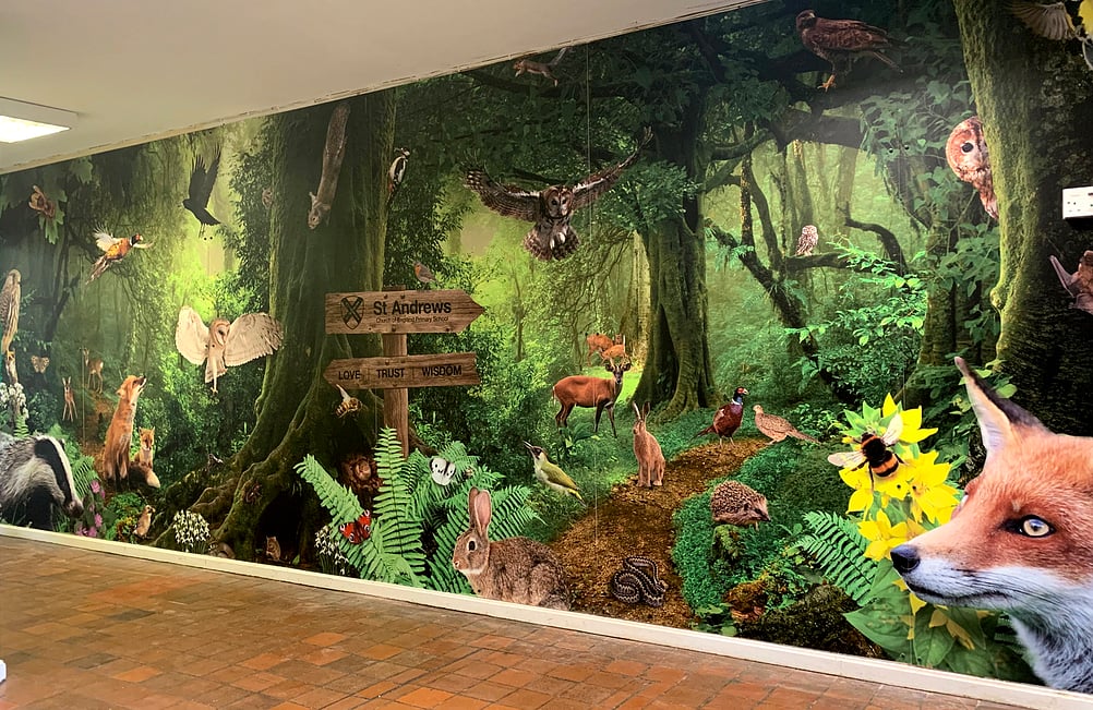 St. Andrews C of E Primary School are a village school based in Weeley, Essex. To improve and brighten up the entrance hallway they required a large wall graphic of a woodland scene with animals in situ and that can be taught as a project and part of the school curriculum. The scene was developed from scratch and each animal was placed in its natural environment.