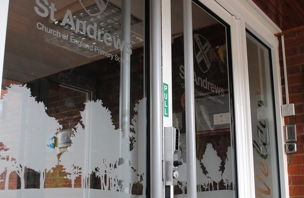 To further improve the entrance we developed a frosted vinyl window graphic of a woodland silhouette that included the schools branding.