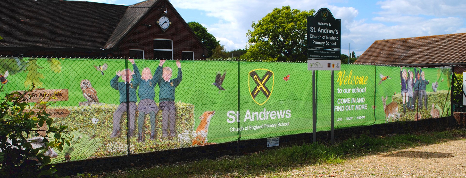 Following this style we designed a large 10 metre mesh banner for the exterior front fence to draw more attention to the school. This included a hedge, woodland animals and actual student images.